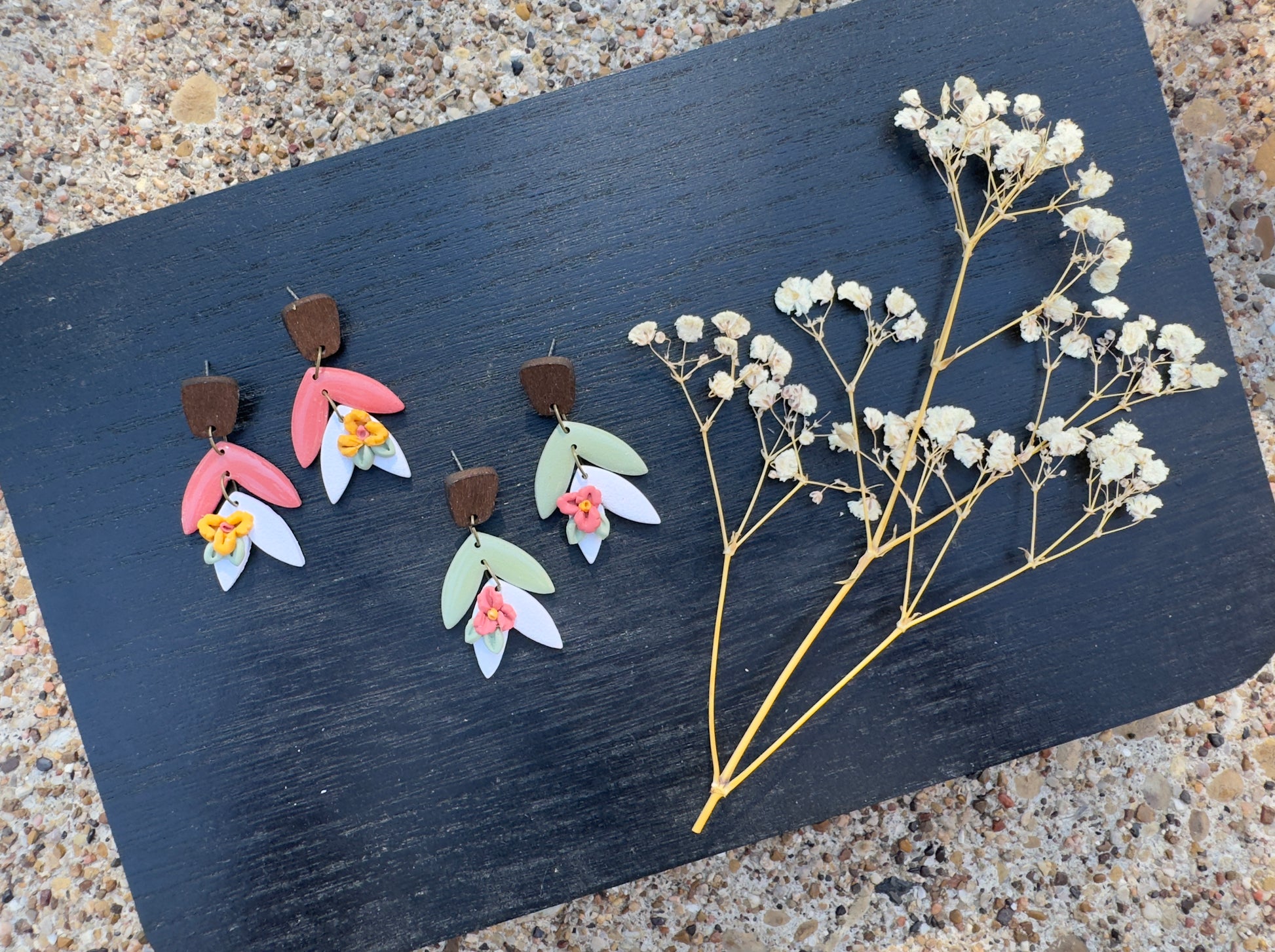 Boho dangle earring. Green and grey, with gold glitter and flower.