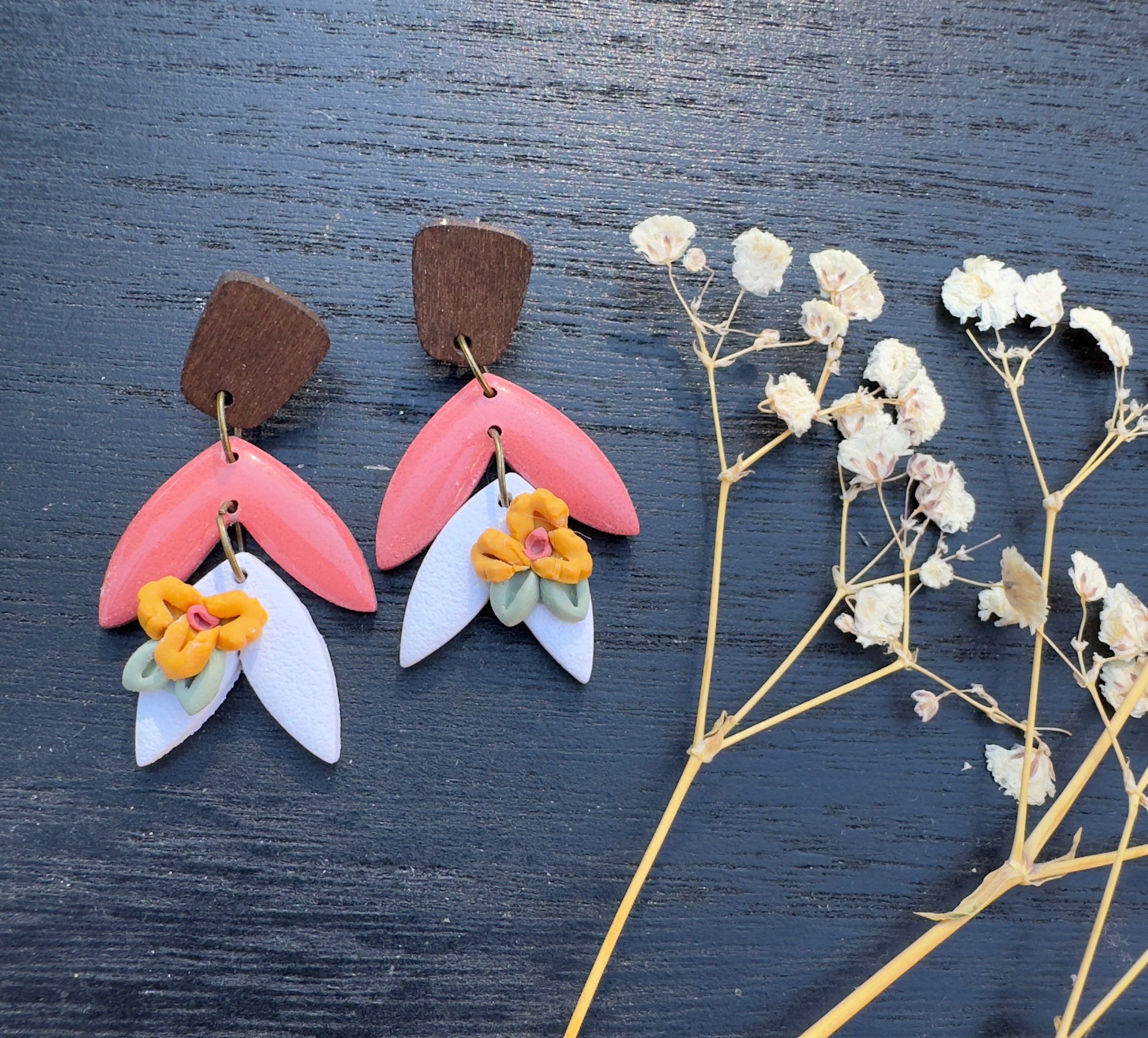 Boho dangle earring. Pink and grey, with gold glitter and flower.