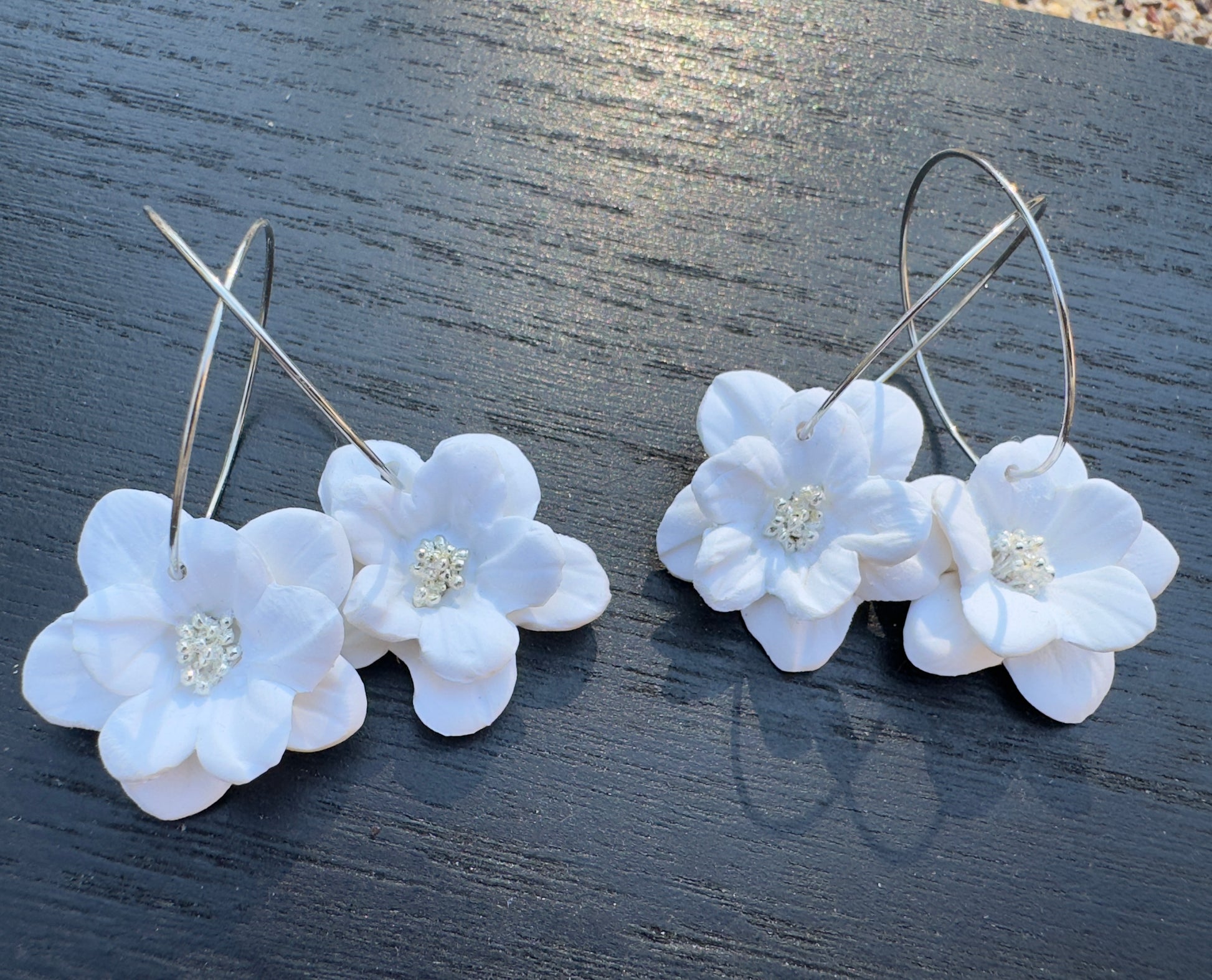 These elegant hoop earrings feature stunning white flowers handcrafted from high-quality polymer clay and delicately attached to delicate silver hoops. The lightweight design ensures comfortable wear while adding a touch of natural beauty to any outfit. Expertly crafted with precision and attention to detail, these earrings are a versatile addition to any jewelry collection.